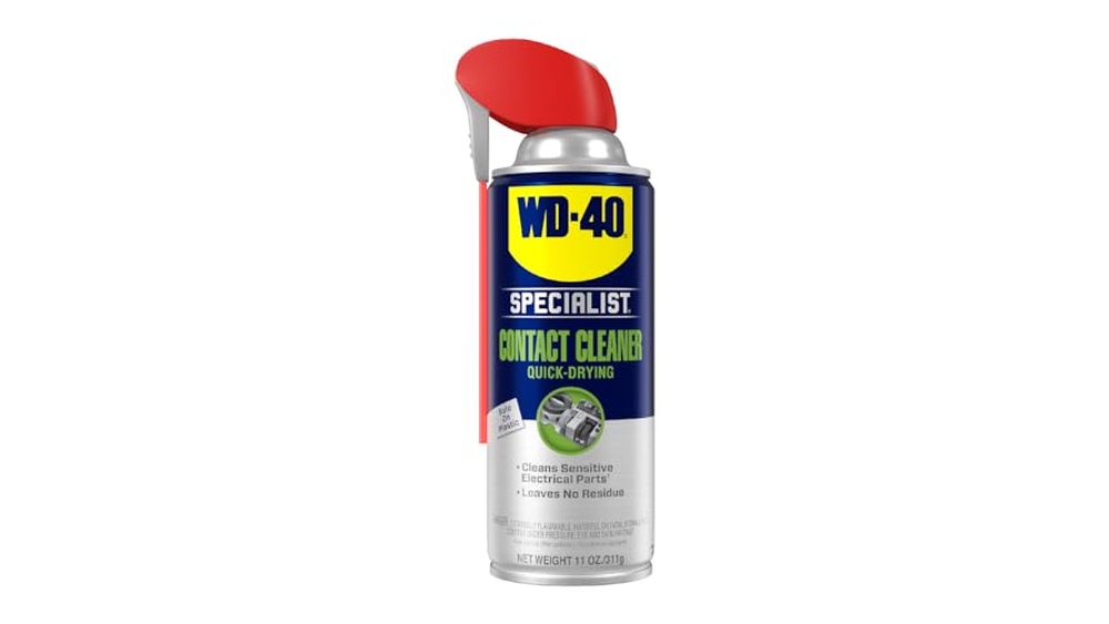 WD-40 Specialist Contact Cleaner Spray is a quick-drying solution that removes oil, dirt, and flux residue from sensitive electrical components like car sensors. It addresses common issues such as sensor malfunctions caused by contaminants without leaving any residue behind.
