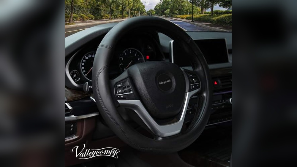 This steering wheel cover from Valleycomfy is made of soft microfiber leather designed to improve comfort while driving. It addresses the common problem of slippery or hard steering wheels by providing a breathable, cushioned surface with a durable rubber inner lining that enhances grip.