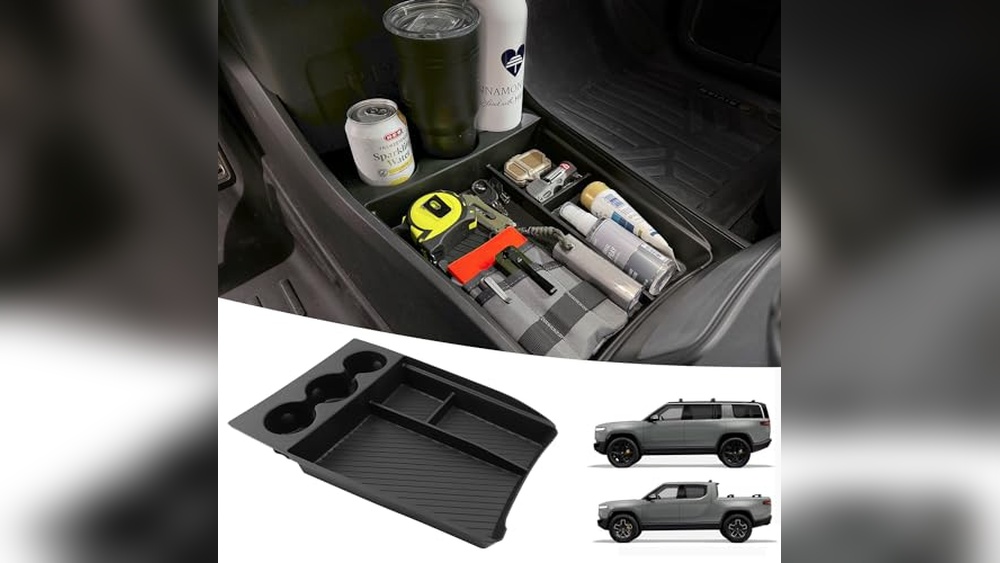 - Organizes small items neatly inside the Rivian center console.