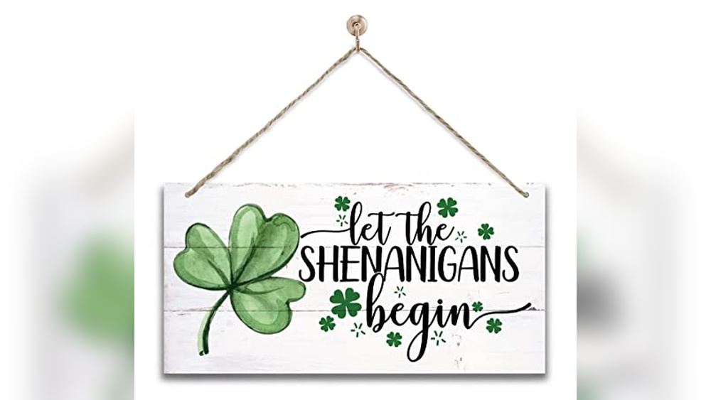1. Hanging St. Patrick’s Day Wooden Decor – ‘Let the Shenanigans Begin’ Wall Art, Home & Door Sign, Shamrock Theme