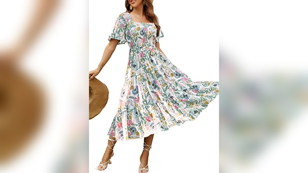 1. Amegoya Women’s Boho Summer Floral Midi Dress Flowy Tiered Flutter Sleeve Square Neck Smocked Peasant Dress (Flower L)