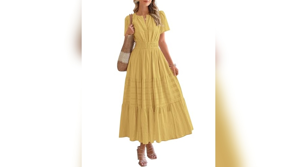 1. BTFBM Womens Summer 2026 Casual Midi Maxi Dresses Lightweight Short Sleeve V Neck Elastic Waist Boho Beach Dress Pockets(Yellow, Large)